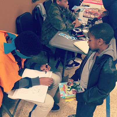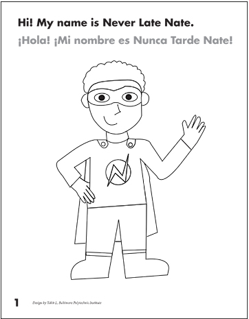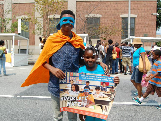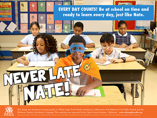 Abenteeism in pre-k and kindergarden predicts lower test scores as well as poor attendance and retention in later grades. In order to address this issue in Baltimore, High schoolers in Wide Angle Youth Media's Attendance and Design Team created a superhero character, Never Late Nate, to appeal to younger students and help promote attendance in the early grades. Never Late Nate posters have been distributed to all Baltimore City elementary schools and his interactive attendance activity book is used in Pre-K and K classrooms with Experience Corps. He has also been known to make appearances at the Mayor's Back To School Rally and different school events.